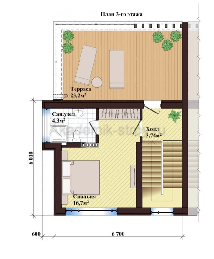 Третий этаж может служить либо зоной отдыха, либо техникой зоны. Например, здесь можно оборудовать уютную мансарду, небольшой кабинет, спортзал или комнату для хобби. Дополнительный санузел на третьем этаже станет важным преимуществом, особенно если дом посещают гости или проживает несколько поколений.