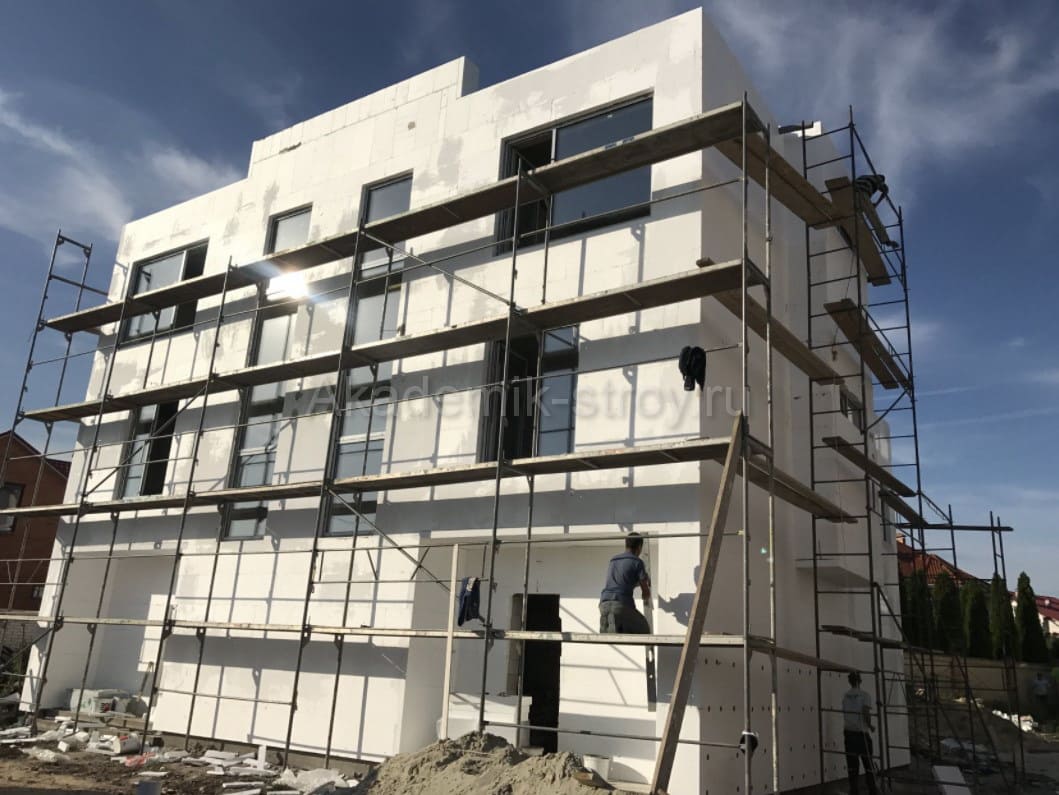 - Возведение фундамента. Оптимальным выбором для трёхэтажного дома становятся ленточные или свайные фундаменты, учитывающие нагрузку от стены и этажности.
