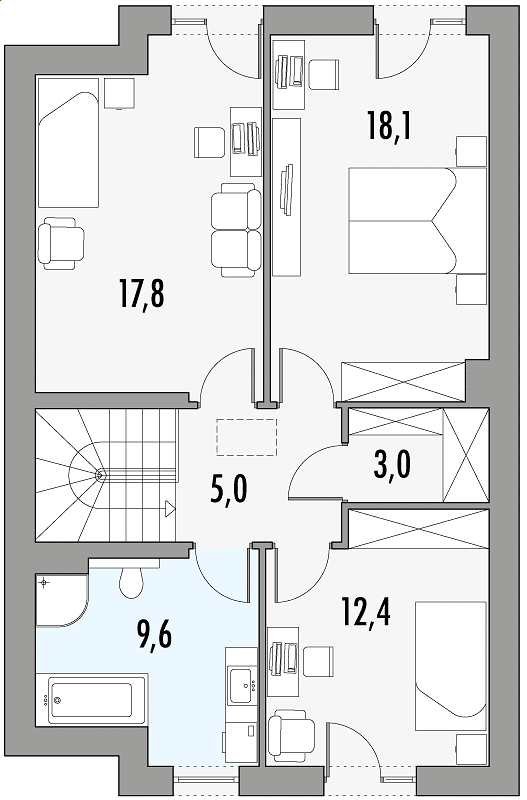 Комфорт в доме во многом определяется грамотным расположением спален и санузлов. В рассматриваемом проекте предусмотрено три спальни – достаточно для семьи из четырех-пяти человек или же для тех, кто любит принимать гостей на длительный срок. Каждая спальня имеет хорошие размеры, удобные для мебели и личных вещей, а также хорошо освещена естественным светом.