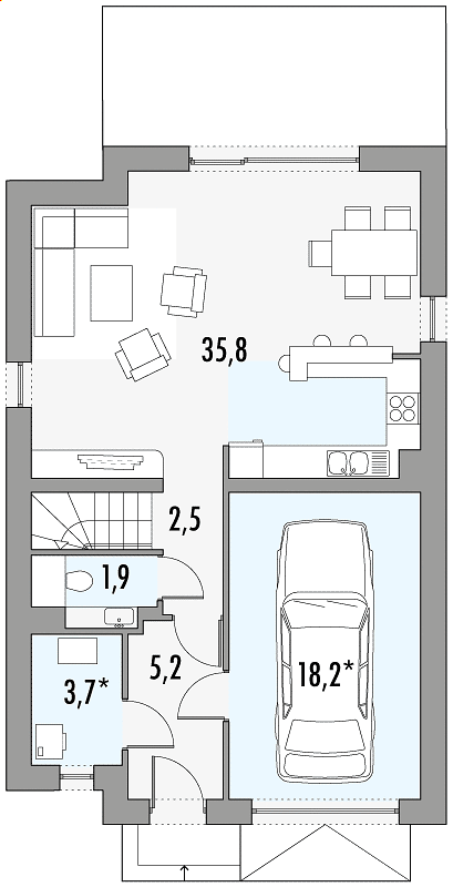 Одним из важных плюсов данного проекта является продуманная архитектура и конструктивные решения. Дом имеет двускатную крышу с углом наклона 35 градусов. Это оптимальный вариант для региона Москвы, позволяющий эффективно бороться с накоплением снега зимой и обеспечивающий хороший дренаж дождевой воды. Такая крыша также даёт возможность сделать запас чердачного пространства или утеплить дом максимально эффективно.
