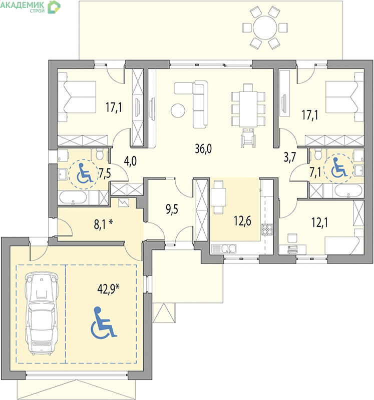 Вложитесь в проект, который позволит вам наслаждаться жизнью в собственном доме, с продуманной планировкой и комфортом, достойным самой современной жизни. Ваш одноэтажный дом 17x16 м от "Академик Строй" — это надежность, проверенная временем, и уют, в который хочется возвращаться каждый день.