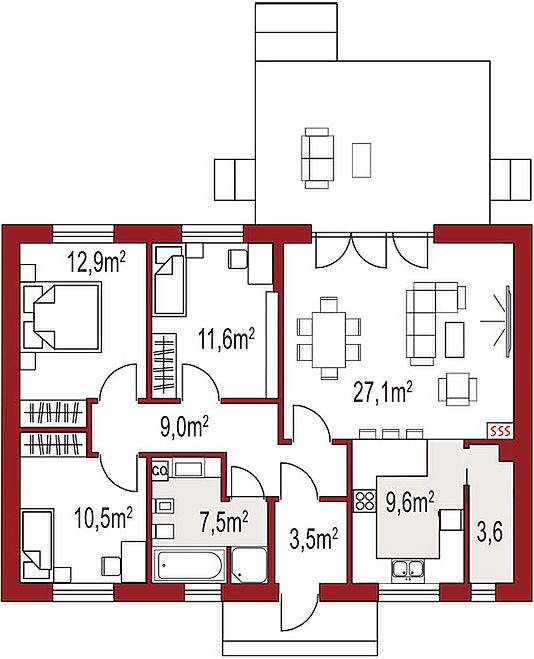 Основные преимущества одноэтажного дома с размерами 13x9 м: