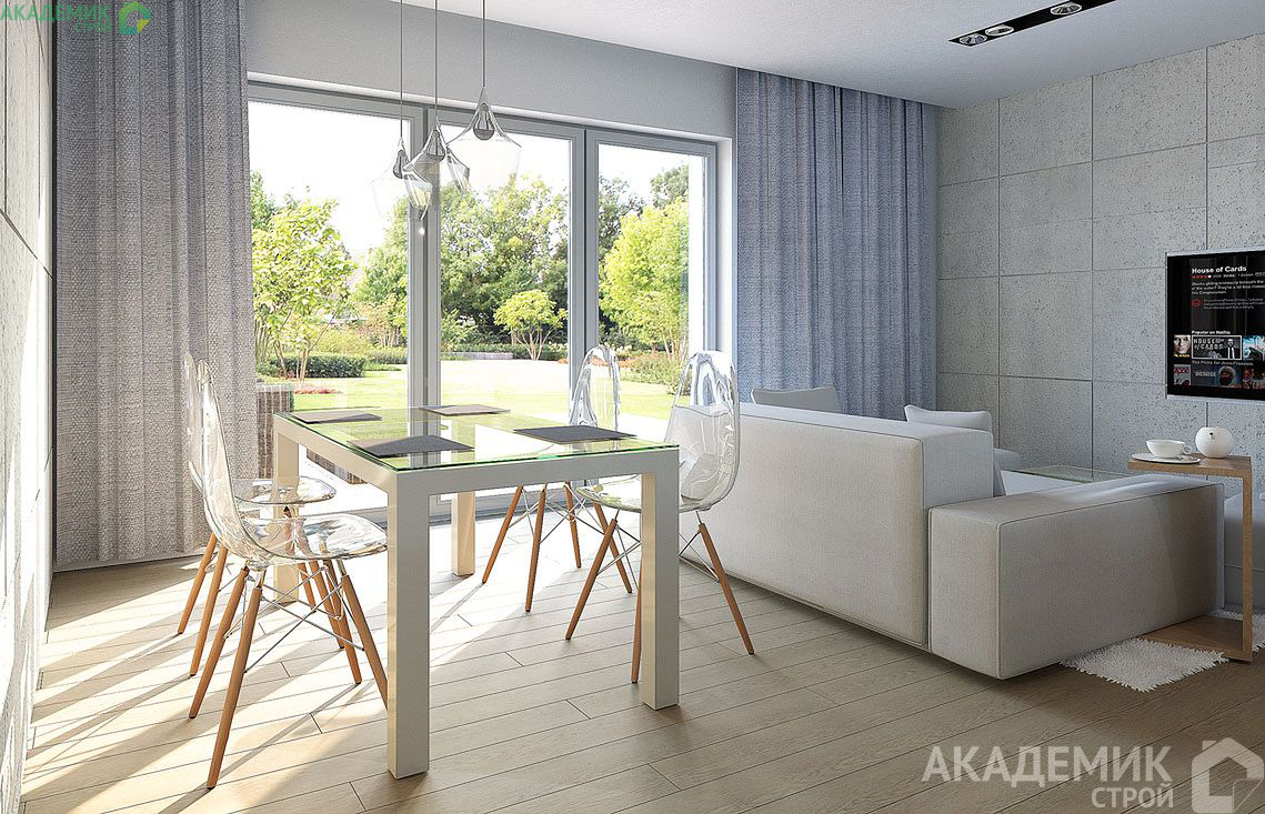 Проект от «Академик Строй» предлагает удобное распределение жилых и вспомогательных помещений для максимального комфорта семьи. Основные зоны в доме делятся следующим образом:
