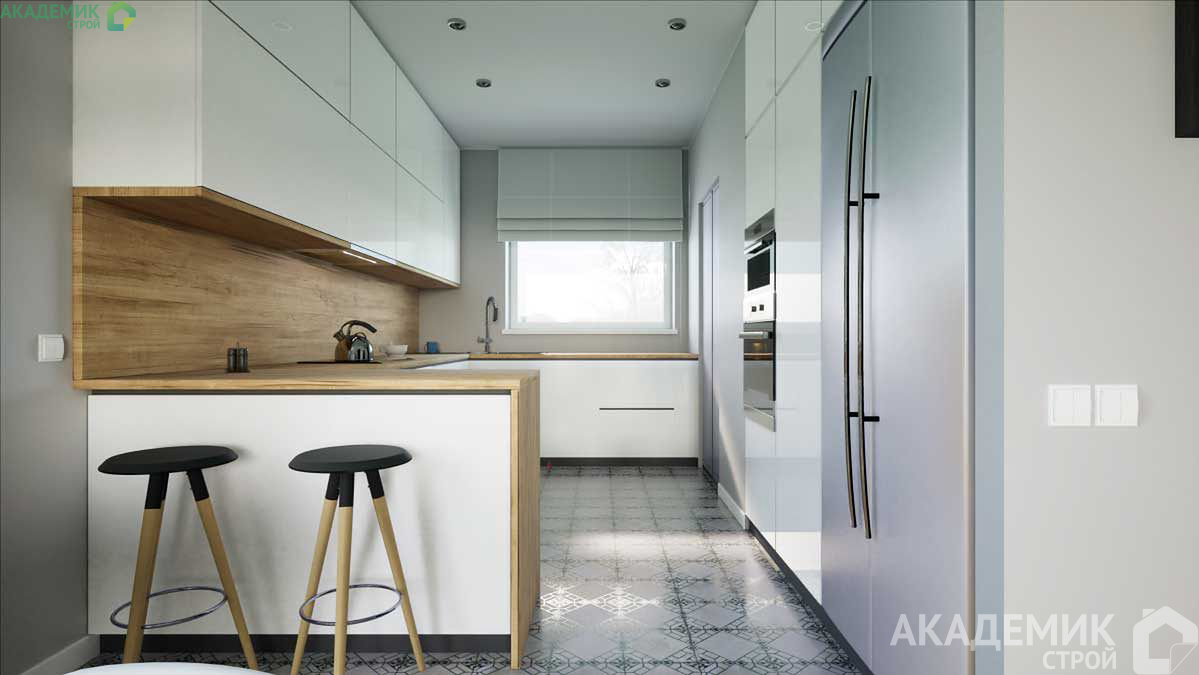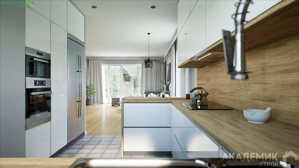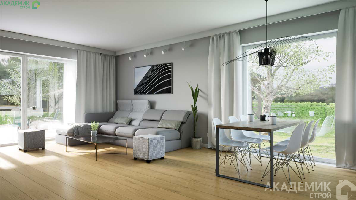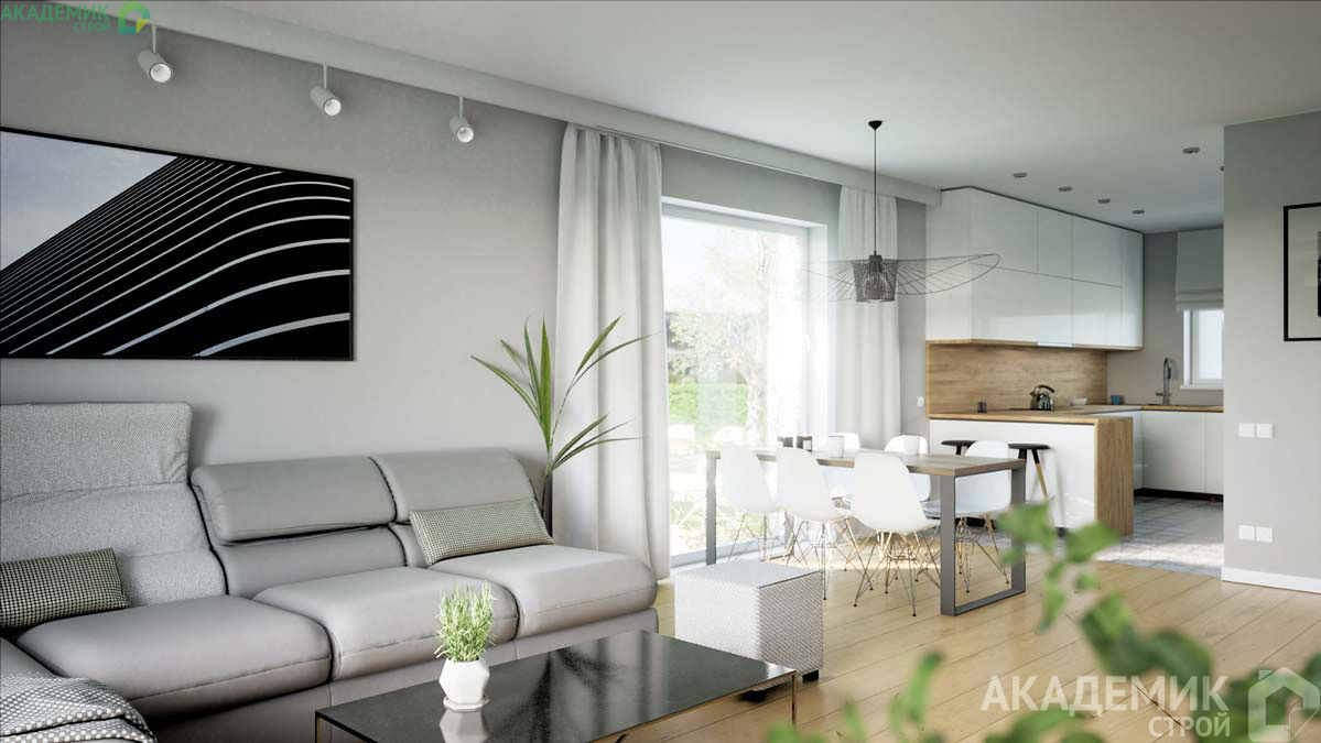 Внутренняя организация пространства в 169,8 м² ориентирована на разделение на две основные функциональные зоны: гостевую и приватную. Гостевая зона включает просторную гостиную с камином — обязательный акцент для создания домашней уюта и тепла, и кухню — место, где собирается семья для совместных приемов пищи и общения. Вторая, приватная зона включает четыре спальни, а также два санузла, которые удобно расположены, чтобы обслуживать жилые комнаты.