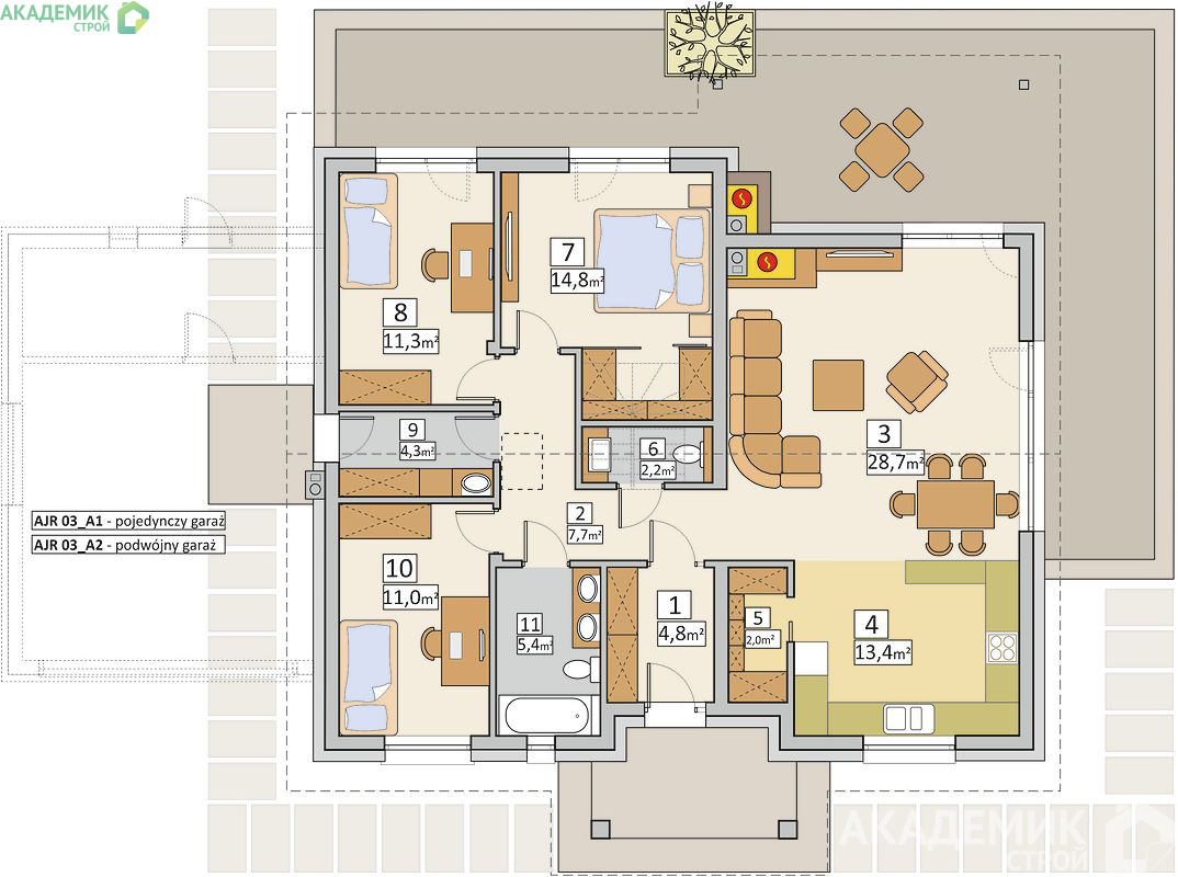 При планировке одноэтажного дома важно уделить внимание не только количеству комнат, но и их взаимному расположению. В проекте «Академик Строй» предусмотрено удобное разделение зон: