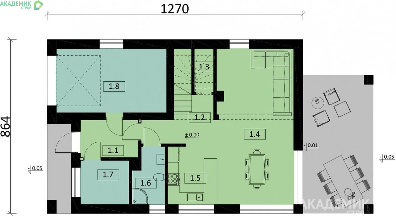 Проект предусматривает наличие террасы — важного элемента загородного дома, позволяющего наслаждаться свежим воздухом и природой в любое время. Терраса идеально подходит для завтраков на свежем воздухе или вечернего отдыха с семьей и друзьями.
