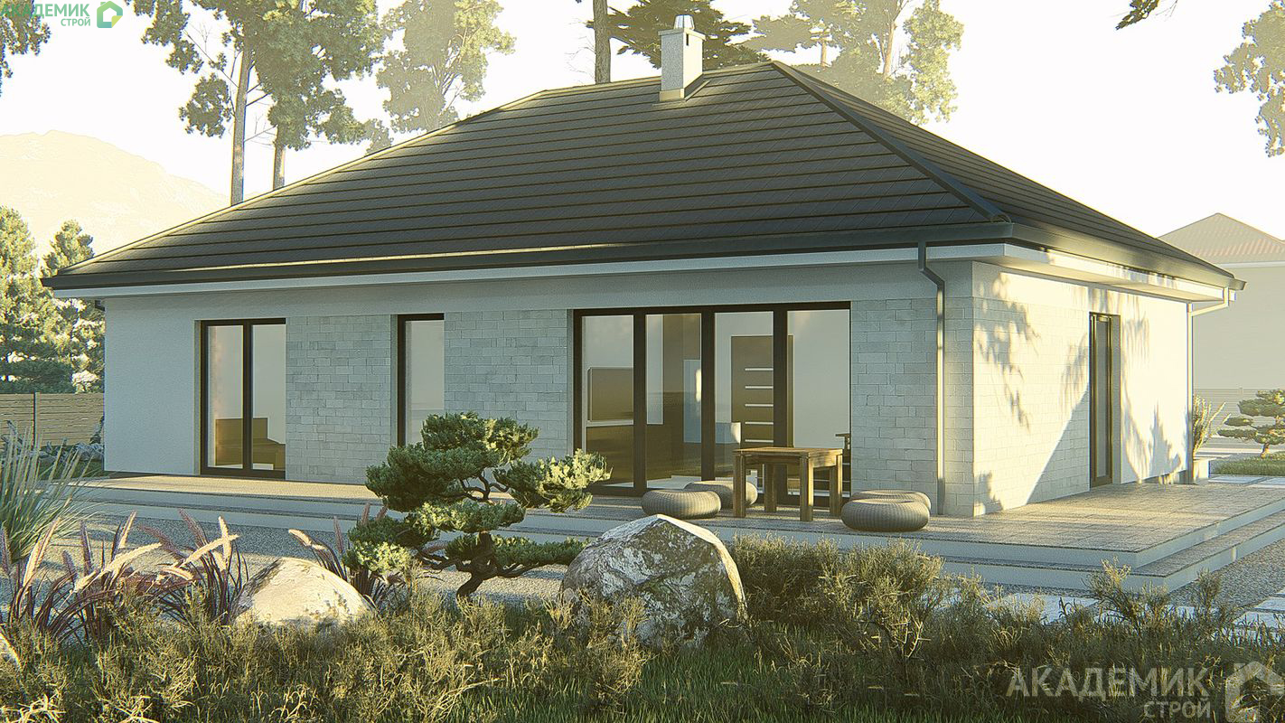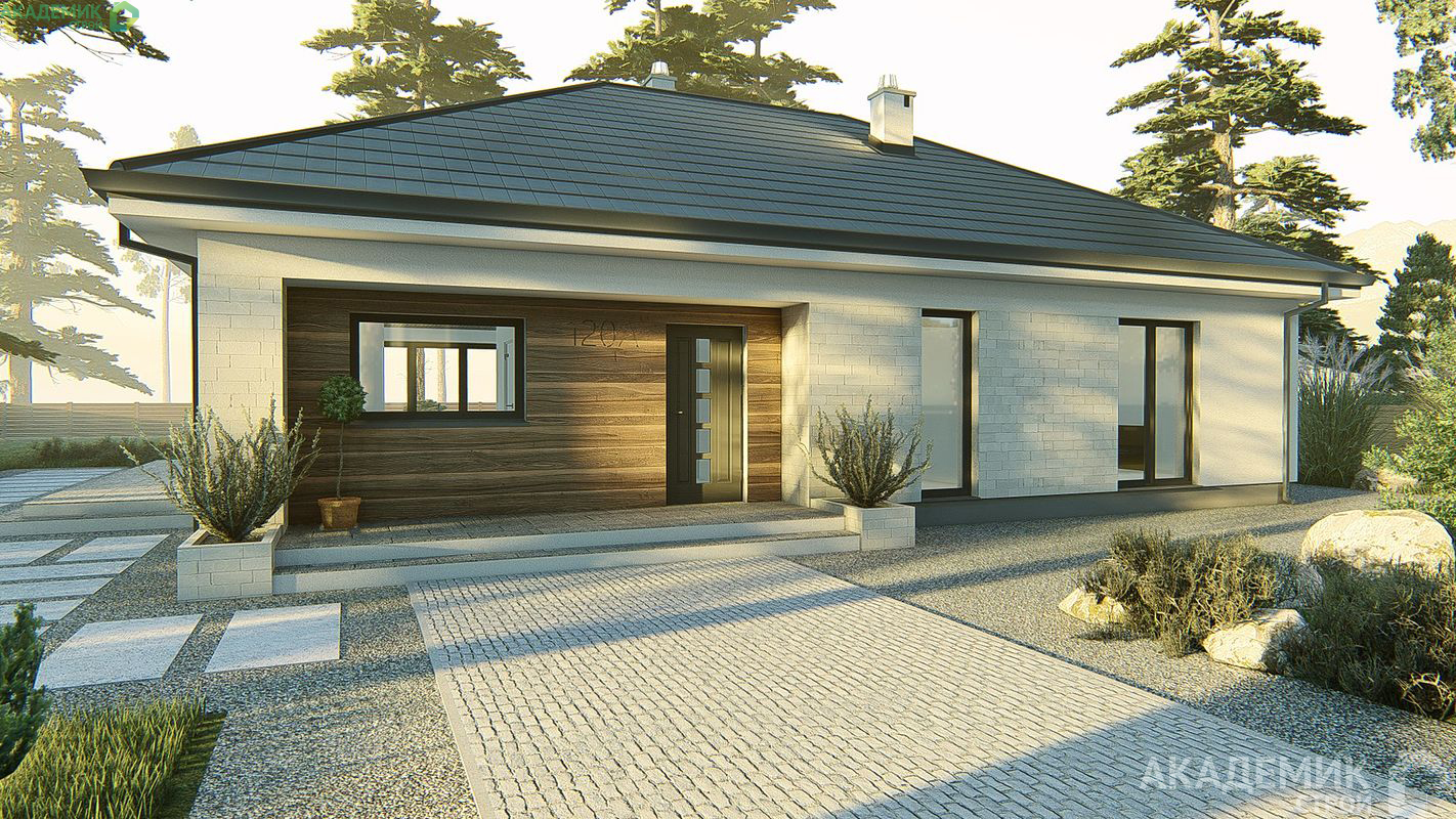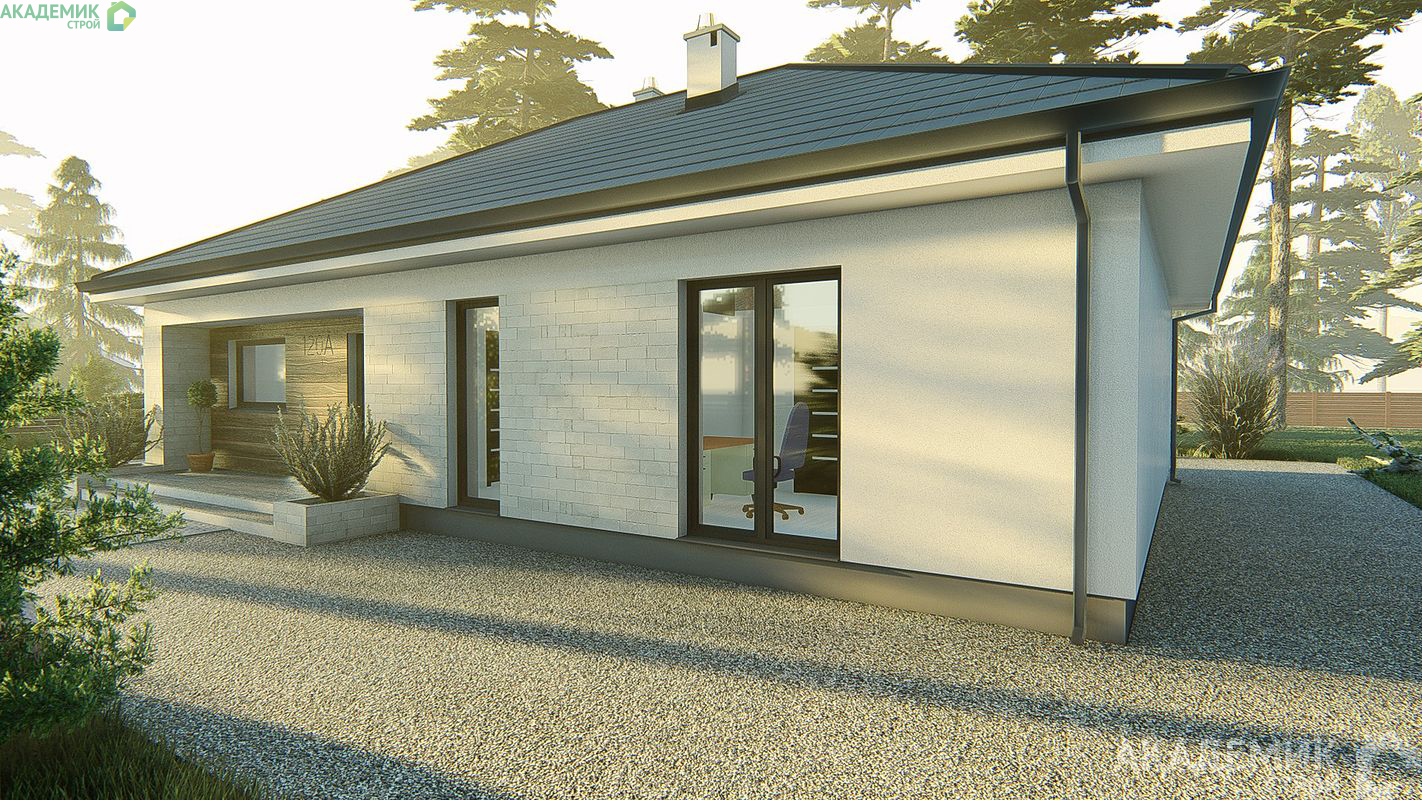 Многие при выборе дома обращают особое внимание на внешний вид и особенности крыши. Для одноэтажного дома «Академик Строй» разработал сложную конструкцию крыши двускатного и вальмового типа с углом наклона 30°. Такой дизайн придает дому особую выразительность и визуальную легкость.