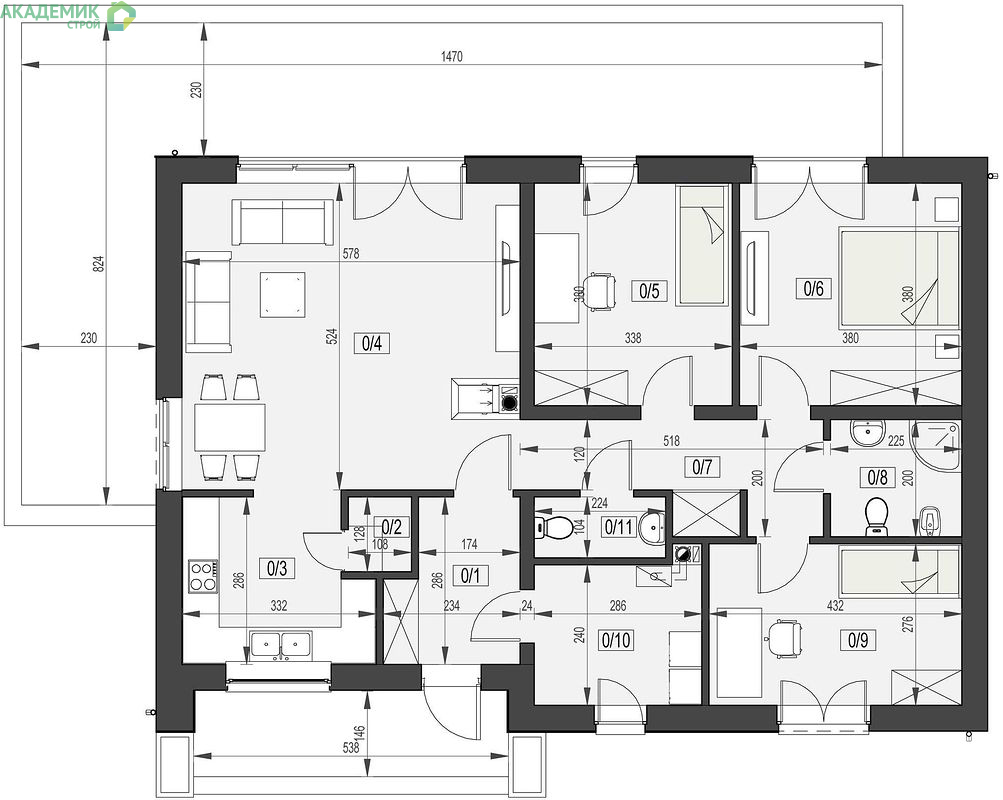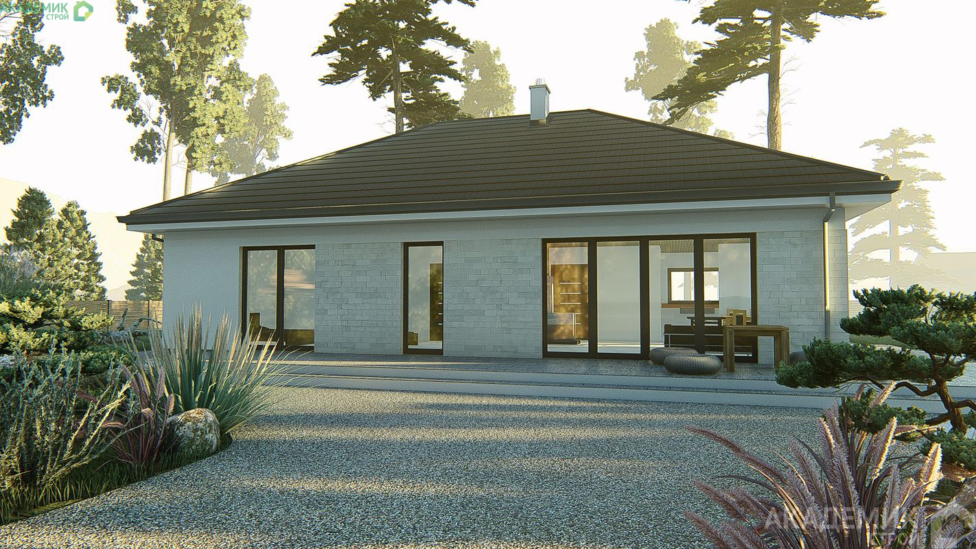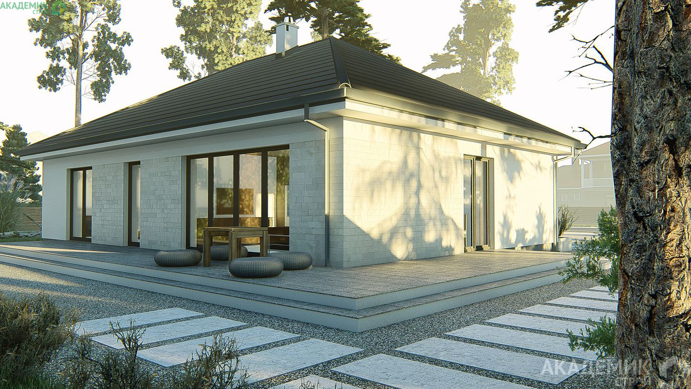 Многие при выборе дома обращают особое внимание на внешний вид и особенности крыши. Для одноэтажного дома «Академик Строй» разработал сложную конструкцию крыши двускатного и вальмового типа с углом наклона 30°. Такой дизайн придает дому особую выразительность и визуальную легкость.
