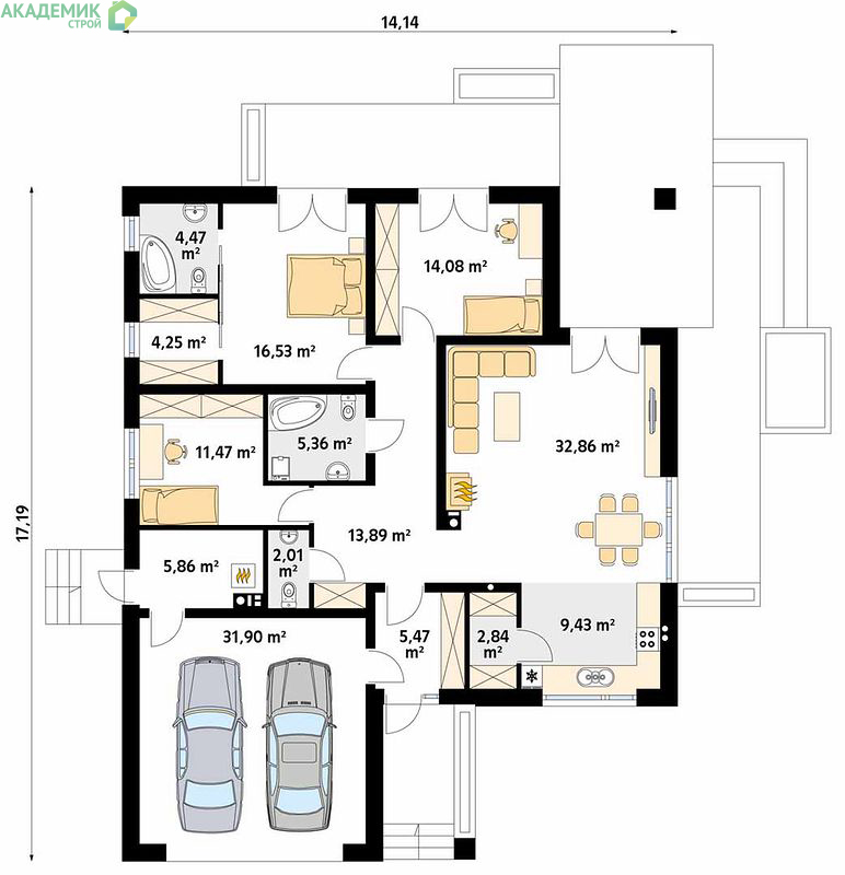 Цена проекта дома 14х18 с площадью 160.42 м² в компании "Академик Строй" доступна многим. Интуитивно понятно, что качественный проект с тремя спальнями, тремя санузлами, камином и террасой по разумной стоимости — большая редкость на рынке.