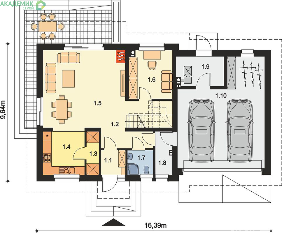 Площадь крыши в этом проекте — 275,30 м², что достаточно для дома подобных габаритов. Это важно при выборе кровельных материалов и расчетах общей сметы на крышу. Эксперты "Академик Строй" помогут подобрать оптимальный вариант, учитывая ваш бюджет и предпочтения.
