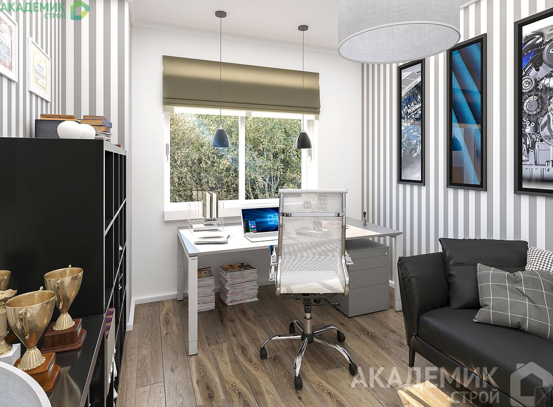 Наличие комнаты на первом этаже — еще одно преимущество. Здесь можно организовать гостевую зону, кабинет или комнату для пожилых родственников. Такое решение увеличивает универсальность дома и делает жильё действительно многофункциональным.