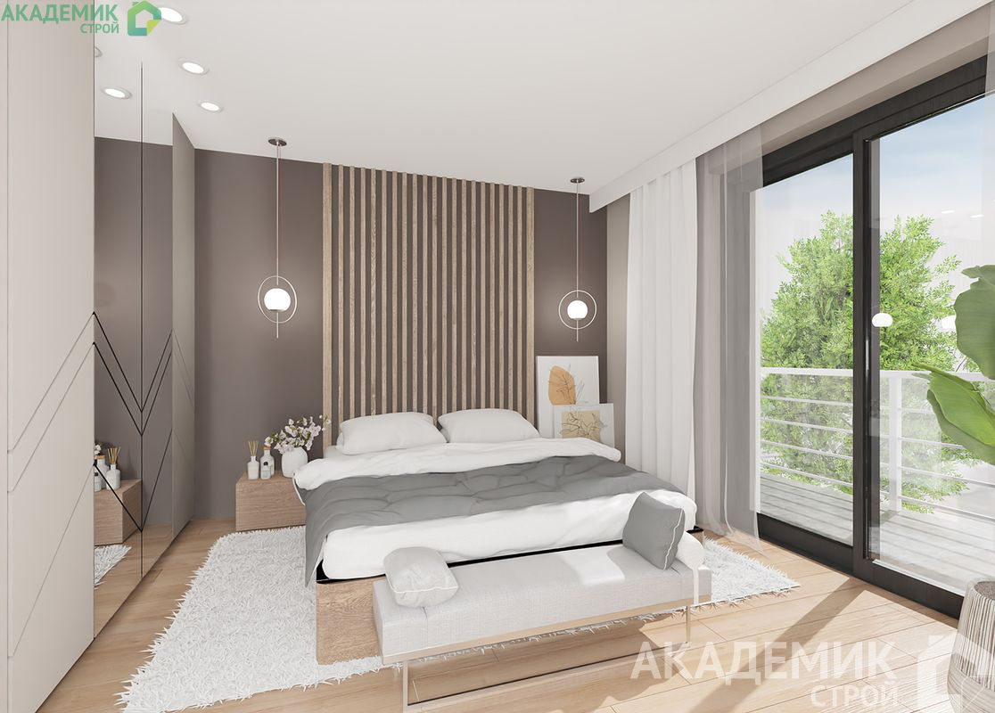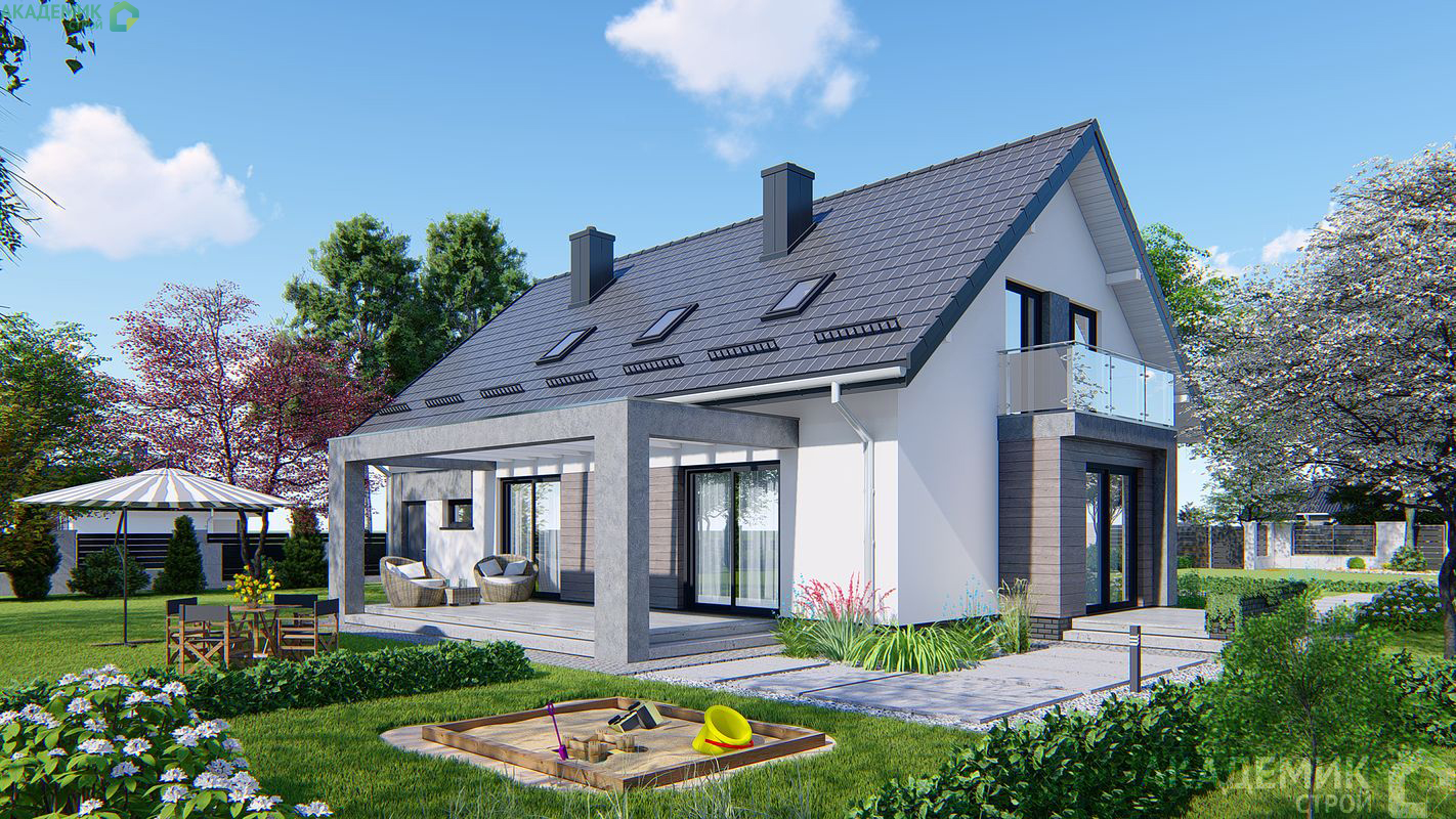 - Выразительный внешний вид: благодаря двускатной крыше с углом наклона 40°, эркеру и террасе, дом выглядит современно и стильно.