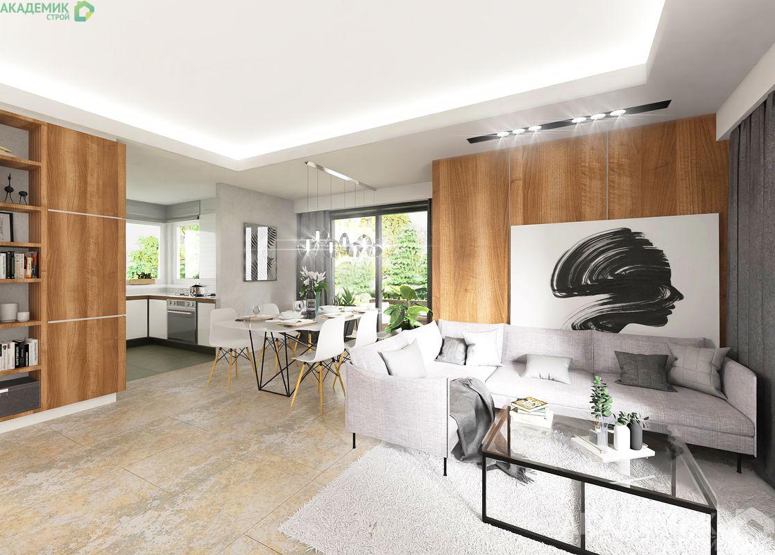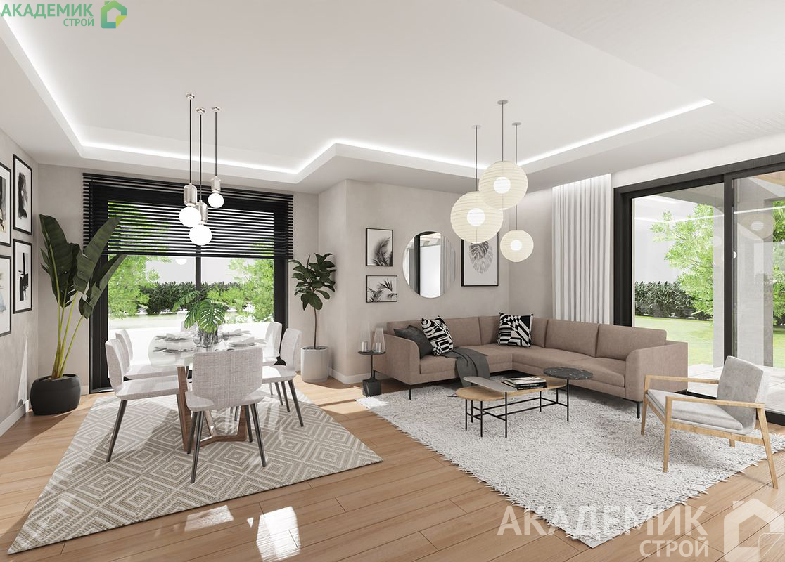 - Четкое деление на жилые и общественные зоны: комфортный первый этаж для гостей и семейных вечеров, приватный второй этаж с четырьмя спальнями.