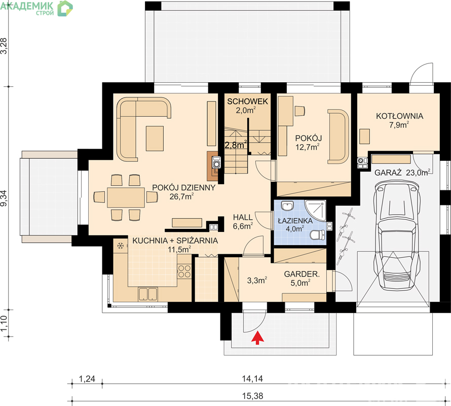 Дом с размерами 15х10 метров занимает площадь застройки 137,2 м², что является оптимальным размером для грамотного зонирования внутри дома и удобства эксплуатации зоны вокруг дома. Площадь нетто дома достигает 210,7 м², что включает в себя все внутренние помещения, стены и технические объемы.