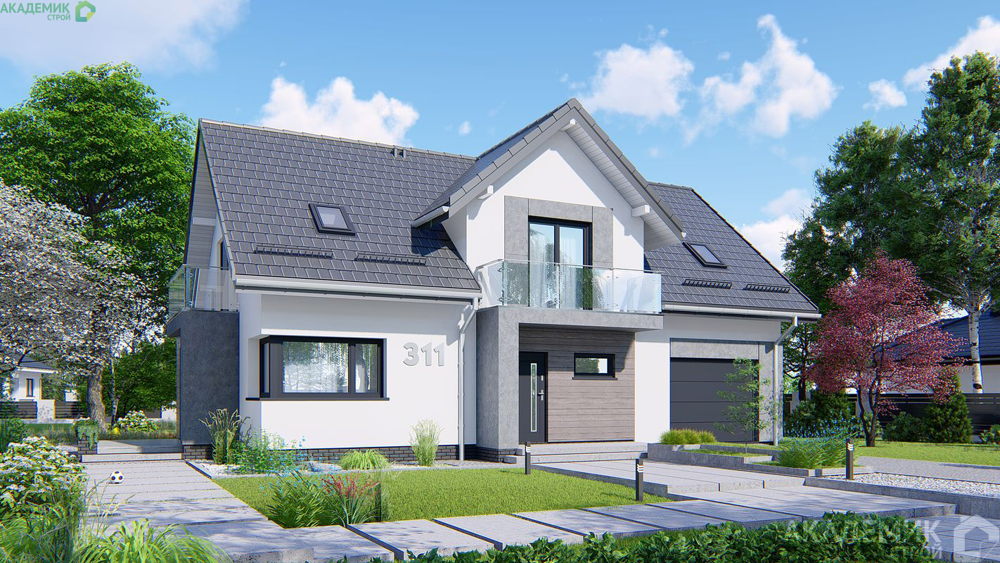 Дом выполнен в классическом стиле с двускатной крышей, угол наклона которой составляет 40°. Такая конструкция имеет не только эстетическое преимущество, но и практические свойства: она хорошо отводит дождевую и талую воду, а также обеспечивает оптимальное пространство в мансардной части.