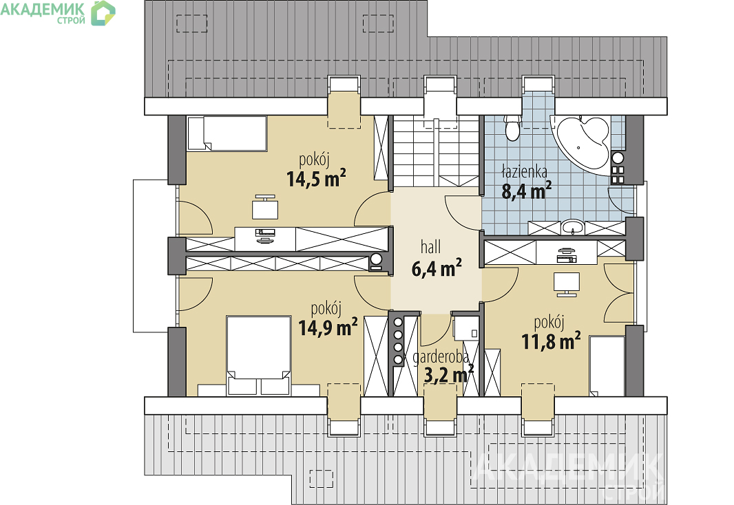 Размеры 12×11 м делают этот проект универсальным: он без проблем впишется в участок минимум 19,65 м шириной и 18,61 м длиной. Традиционный двускатный тип крыши с углом наклона 40° и площадь крыши 198,3 м² по классике строительного дизайна надежно защитит дом от гидрометеорологических факторов, обеспечит правильный сток воды и прекрасную вентиляцию подкровельного пространства.