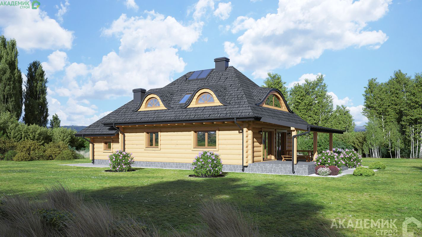 Ну и, конечно, нельзя обойти вниманием архитектонику — двухскатная крыша со сложной формой и "кукушкой" придают дому не только эстетическую привлекательность, но и практичность в эксплуатации. Высота дома 8,49 м делает строительство легким с точки зрения нормативов, а функция комфорта здесь доведена до мелочей: терраса, камин, продуманное зонирование жилья.