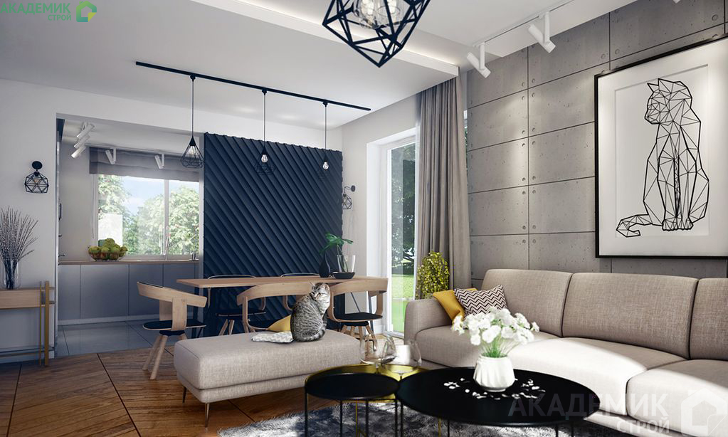 Проект предусматривает наличие камина, который не только создает уютную атмосферу, но и служит дополнительным источником тепла в холодное время года. Такой элемент часто становится центром гостиной, объединяя семью и гостей, а также декоративно дополняет интерьер.