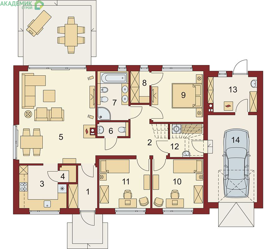 Кроме того, в доме предусмотрена терраса — отличное место для отдыха на свежем воздухе. Терраса становится естественным продолжением жилого пространства в теплое время года, позволяя наслаждаться природой и проводить время с семьей на открытом воздухе.