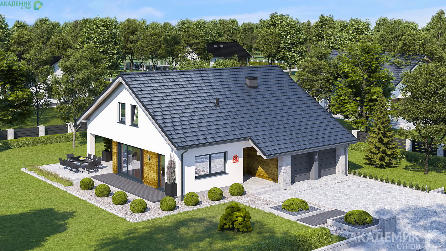 Двускатная крыша с углом наклона 30° — это классическое и очень практичное решение. Такая форма крыши рассчитана на оптимальное отведение дождевой и талой воды, а также ее простоту в монтаже и обслуживании.
