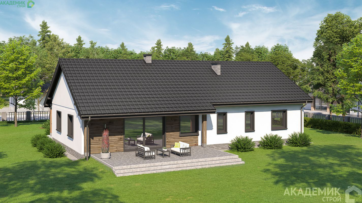 Если вы ищете одновременно просторный, удобный и стильный одноэтажный дом в Москве, проект от компании «Академик Строй» с полезной площадью 188,1 м² – отличный выбор. Такой дом легко адаптируется под любые задачи, обеспечивает комфорт всех членов семьи благодаря четырём спальням и трём санузлам, а также порадует привлекательной двускатной крышей, камином и уютной террасой.