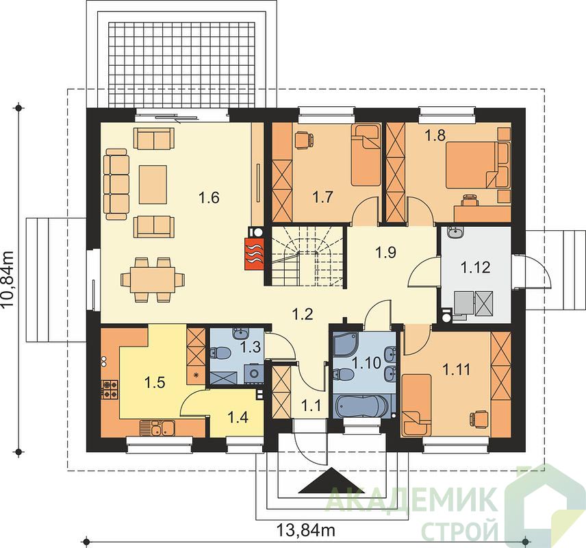 Размеры дома — 14 на 12 метров — являются универсальными, поскольку обеспечивают достаточное пространство для комфортного проживания, одновременно оптимизируя расходы на строительство и эксплуатацию. Такое решение подойдет семье, которая ценит как личное пространство, так и возможность комфортно принимать гостей.
