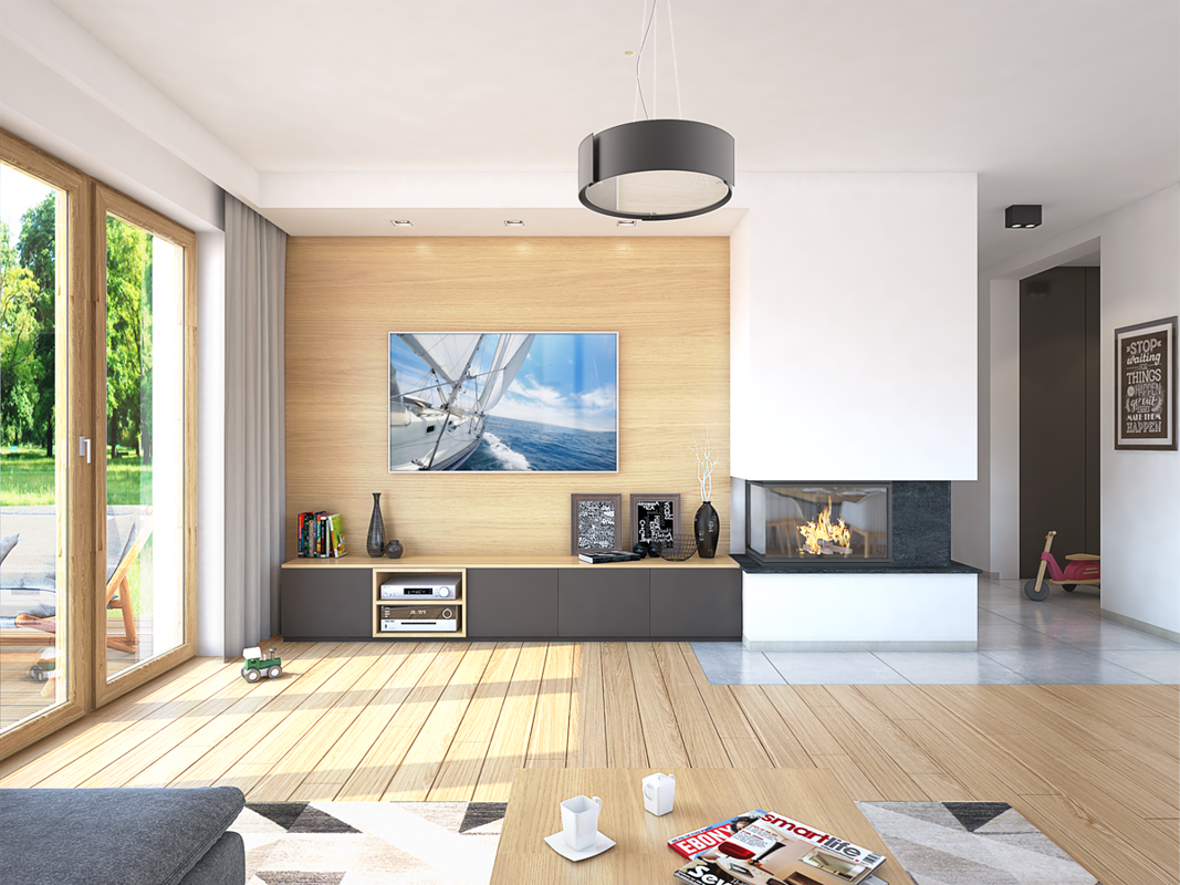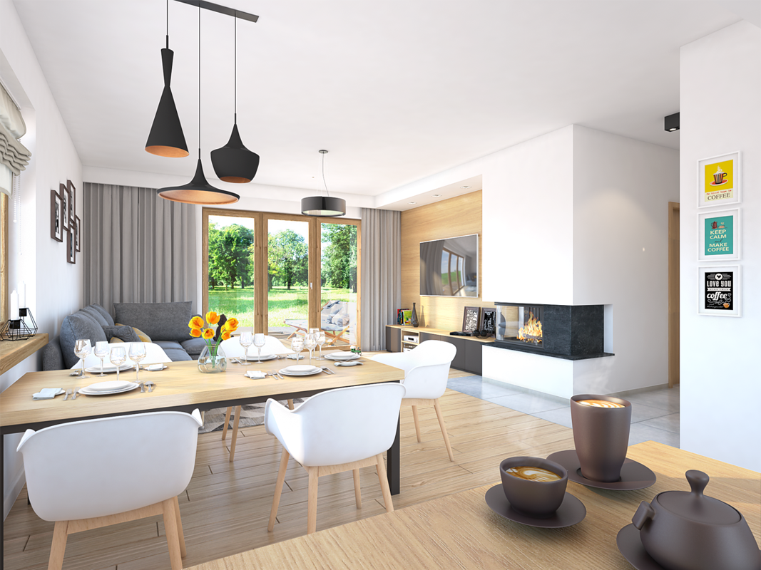 Проект дома дополнен такими удобствами, как камин и терраса. Камин — это не только визуальный и тепловой центр жилья, но и элемент, который привносит в дом атмосферу уюта и домашнего тепла. В холодное время года он помогает экономить на отоплении, внося при этом эстетическое наслаждение.