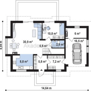 Габариты дома в 9 на 15 метров предоставляют оптимальные размеры для семьи из нескольких человек, которые ценят комфорт и личное пространство. Этот формат позволяет легко зонировать помещение по функционалу и при этом сохранять компактность здания.