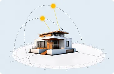 Мы выполняем вычисления, применяя коэффициент КЕО. Осветительные сценарии разрабатываются с учетом местоположения объекта, ориентации проекта по сторонам света, угла наклона солнца и календарных дат.
