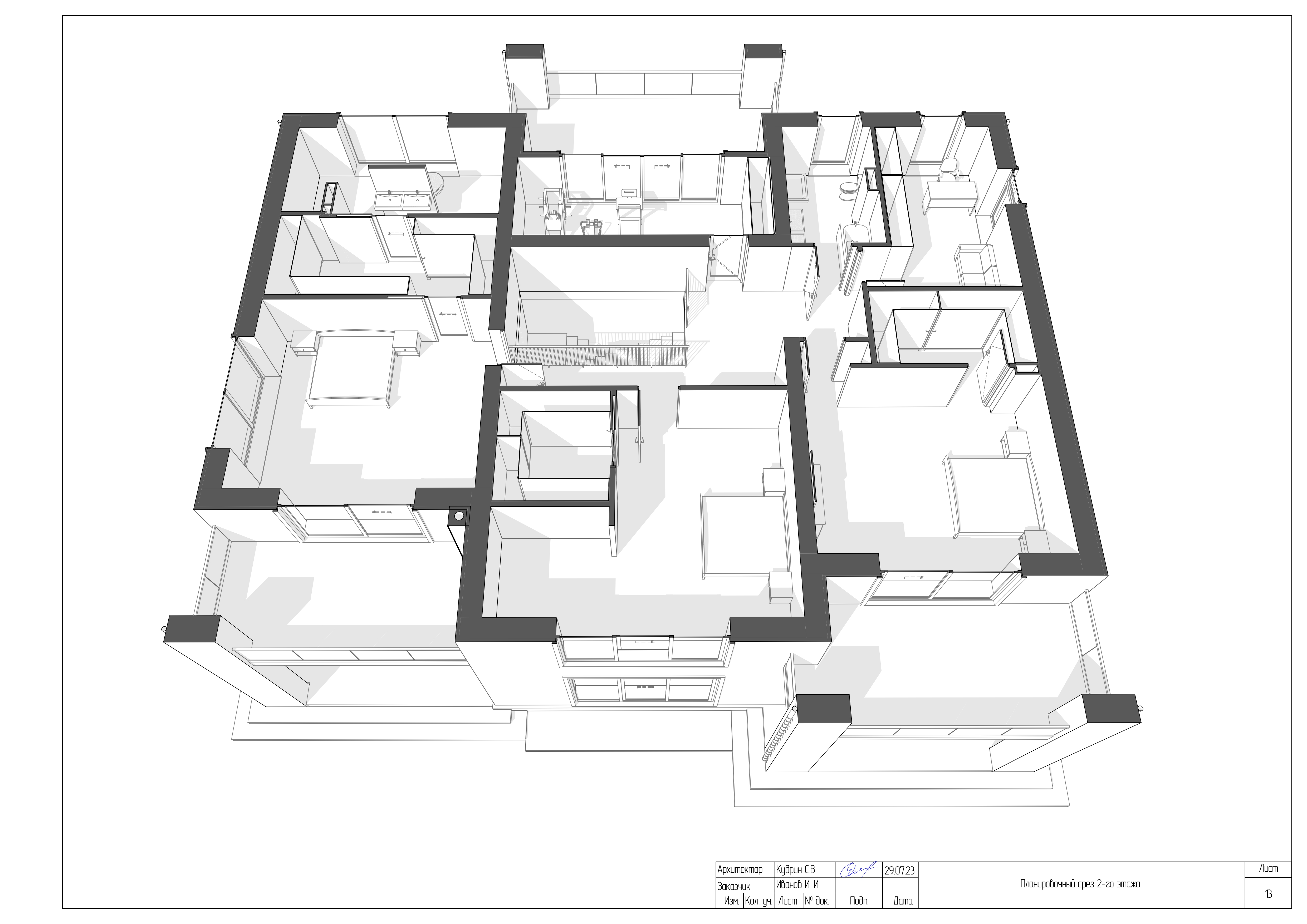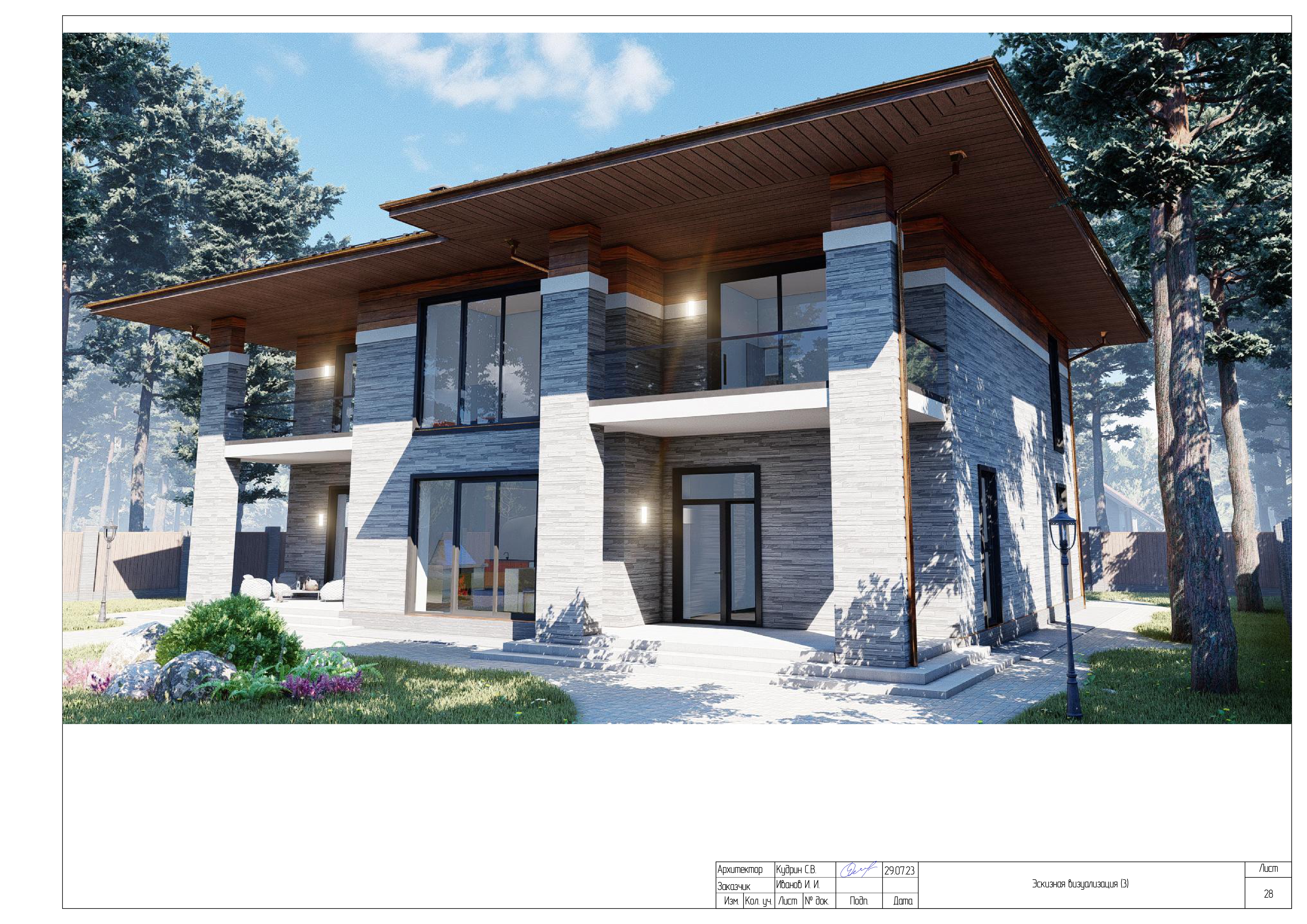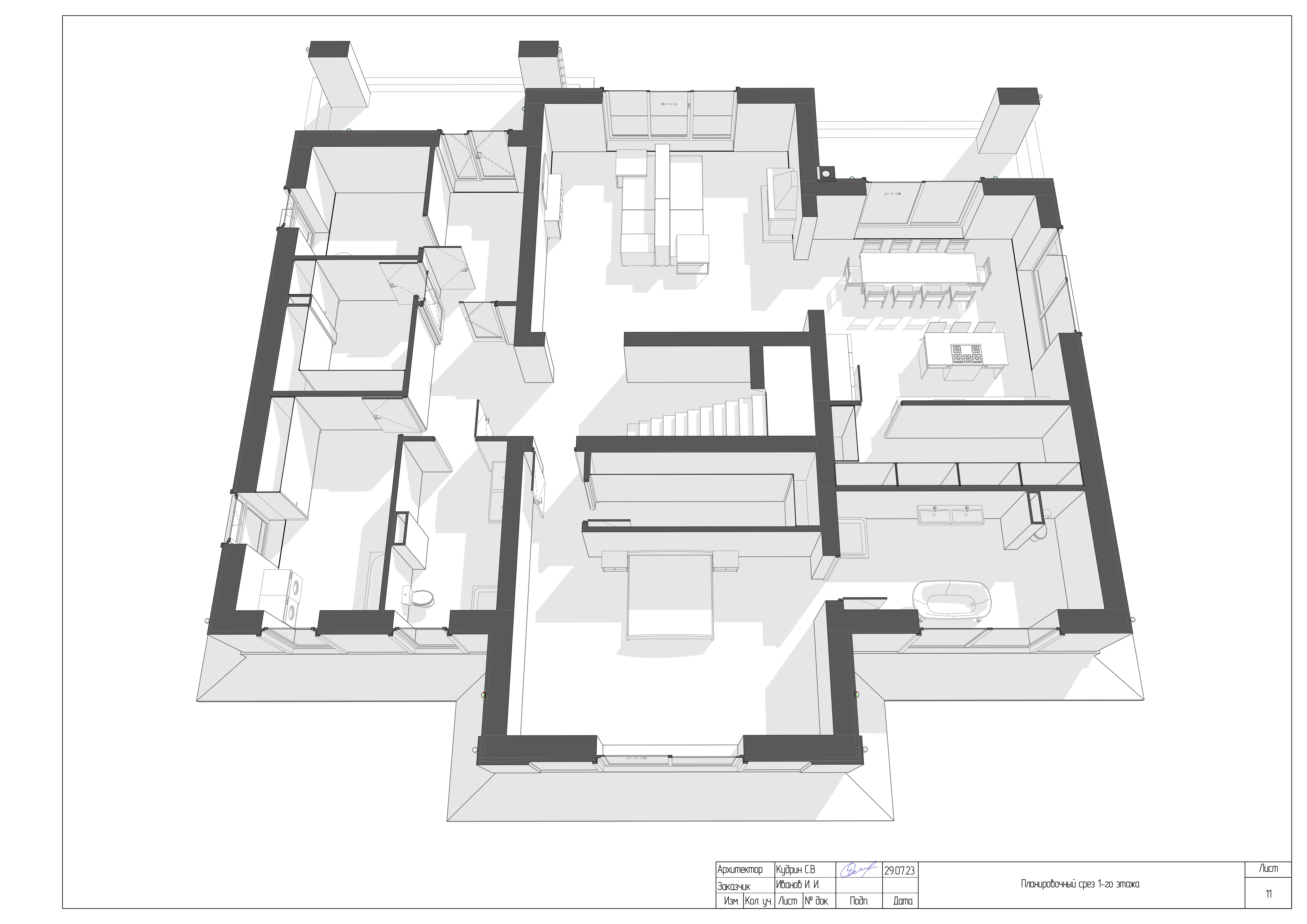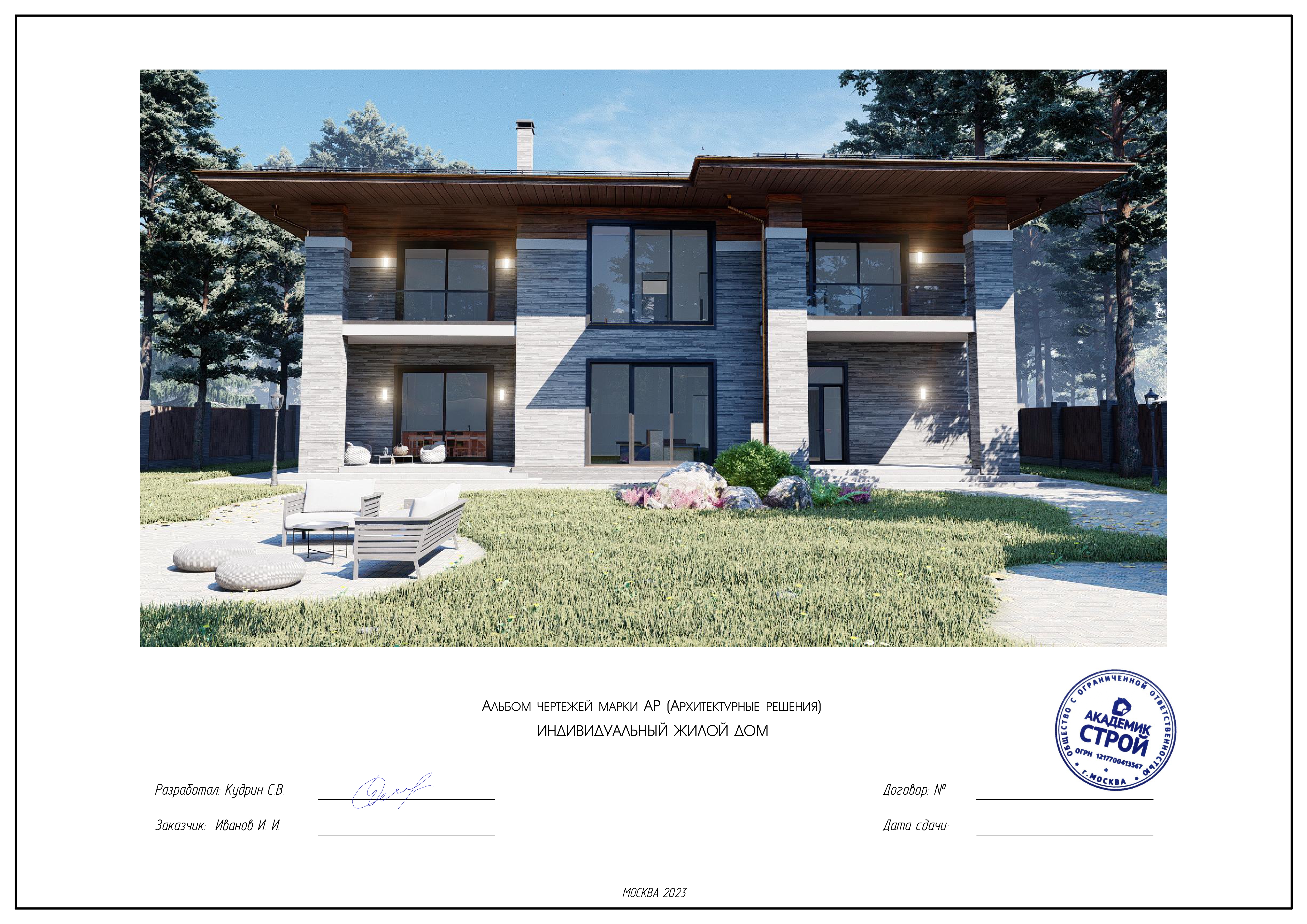 Комплексная документация, которая включает в себя детальные чертежи, планы, разрезы и описания, отражающие все аспекты будущего дома: от пространственной планировки (расположение комнат, этажей, окон и дверей) до конструктивных решений (материалы, фундаменты, кровля) и эстетических особенностей (стиль фасада, дизайн интерьеров, интеграция с ландшафтом).