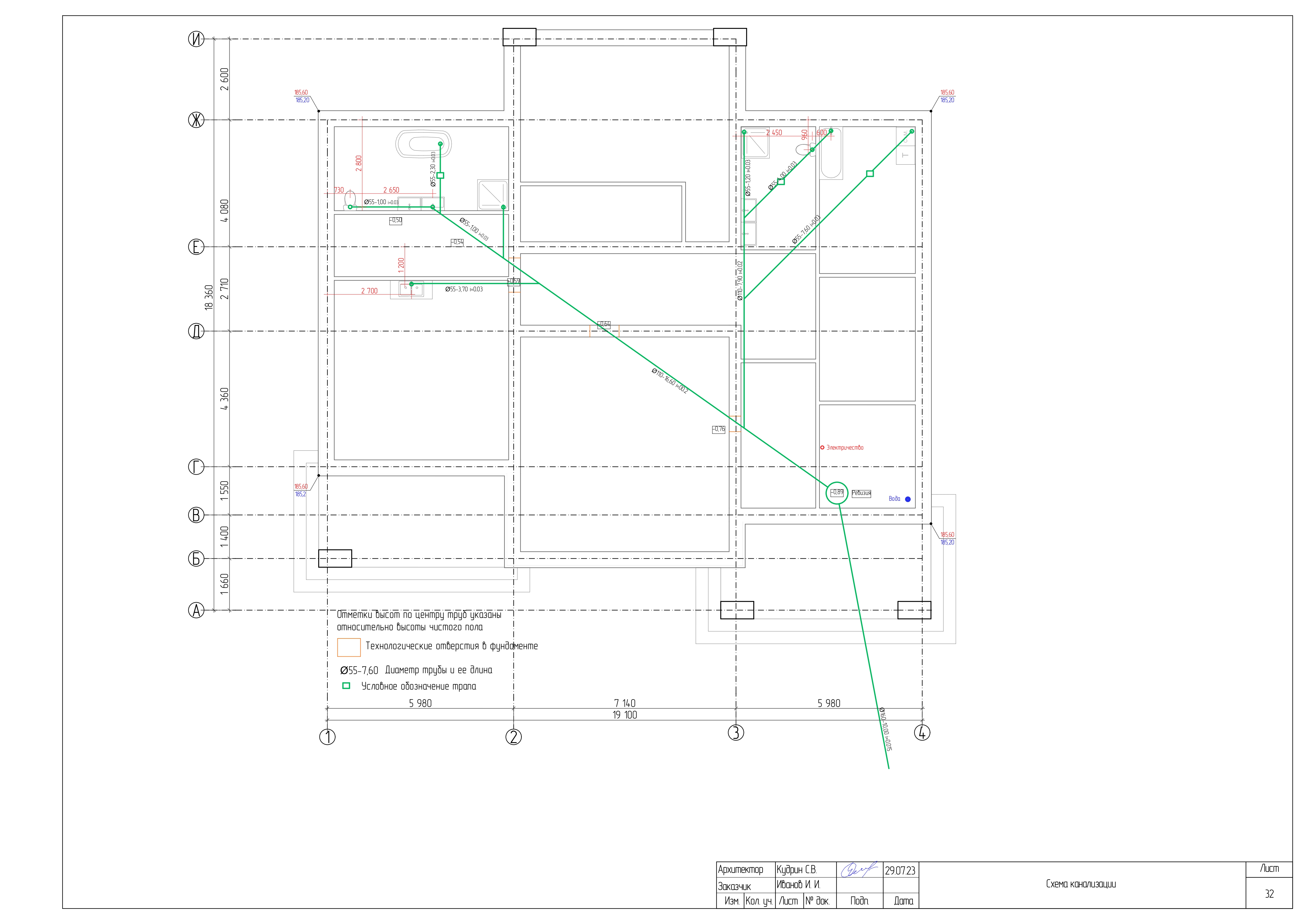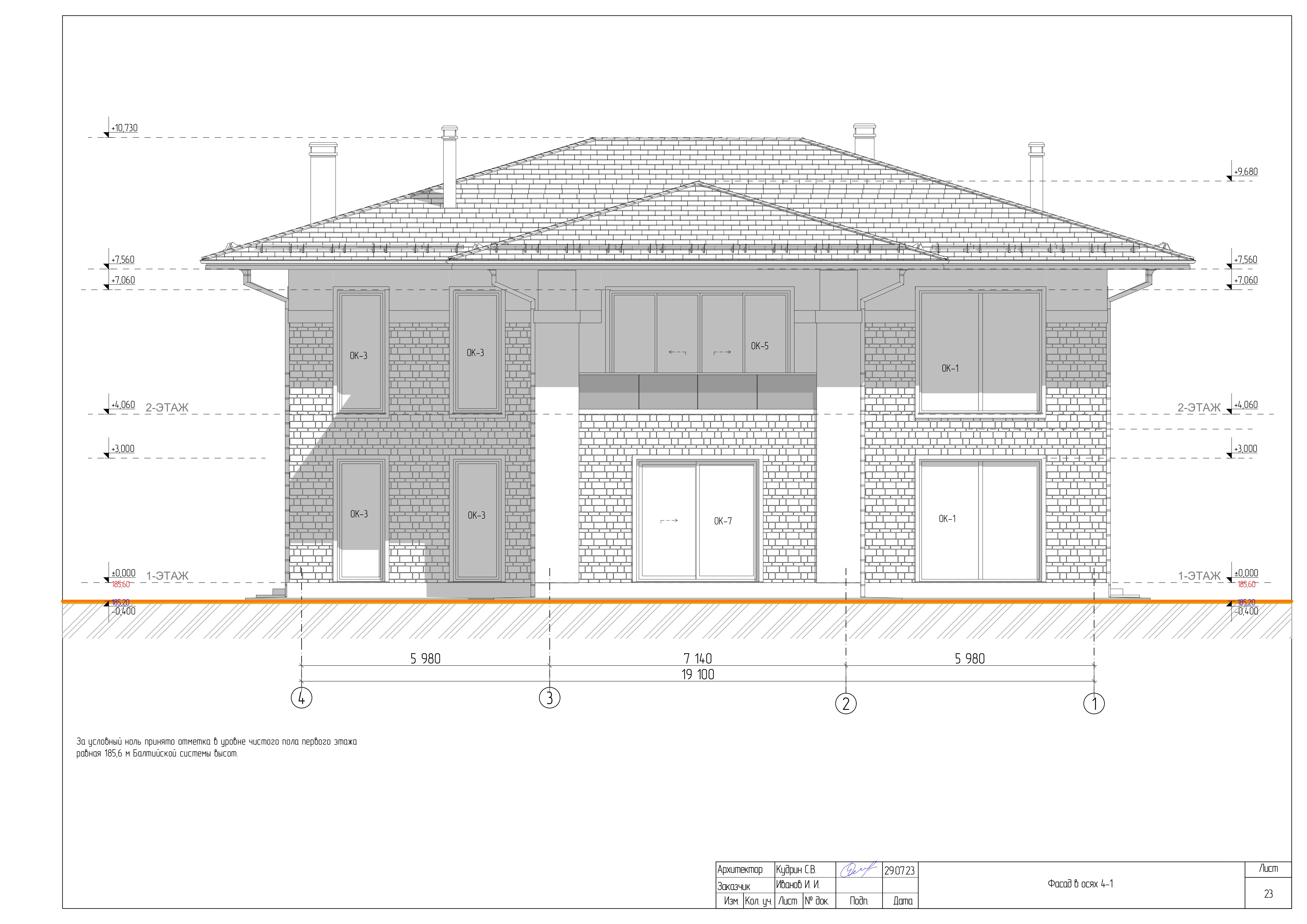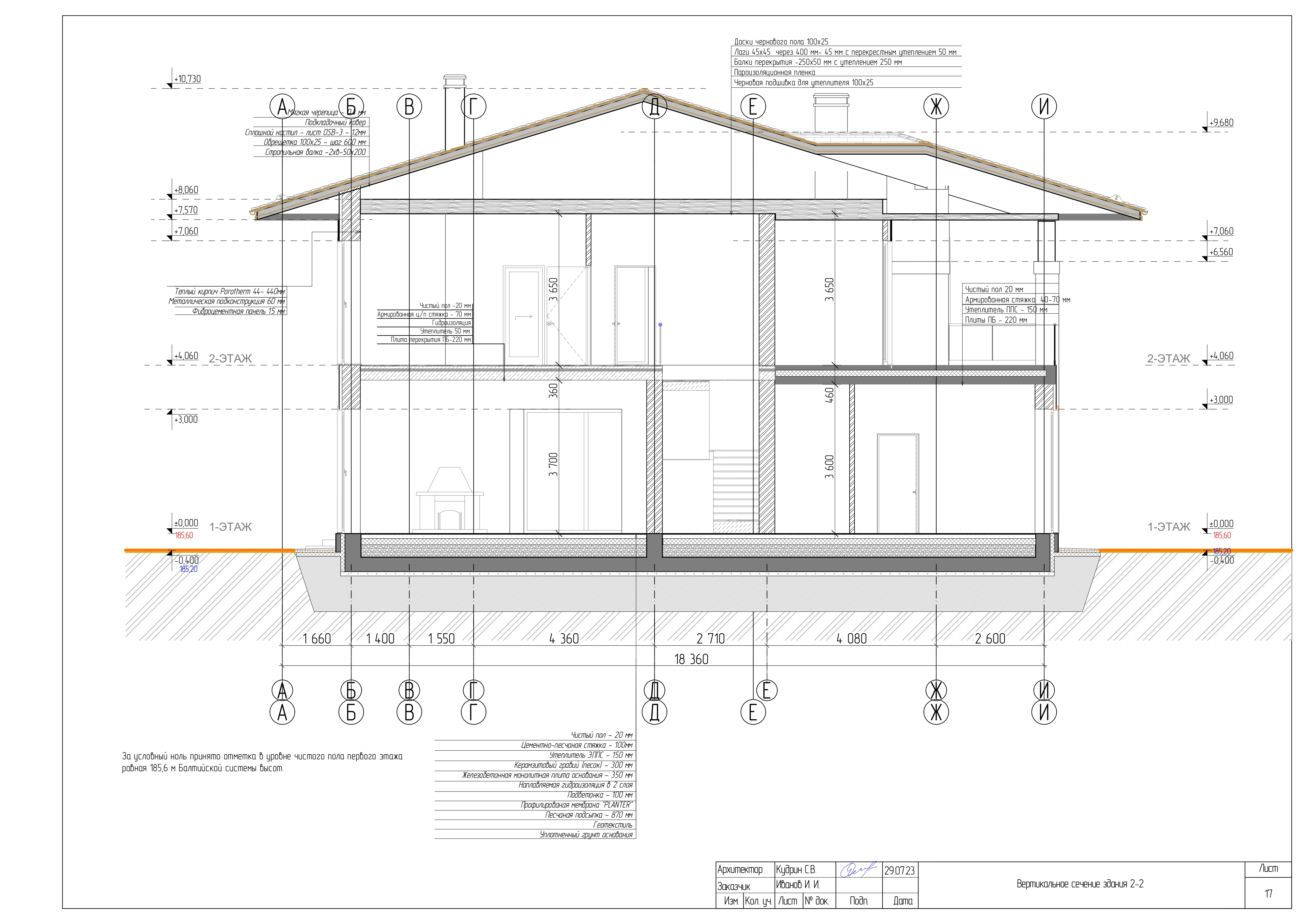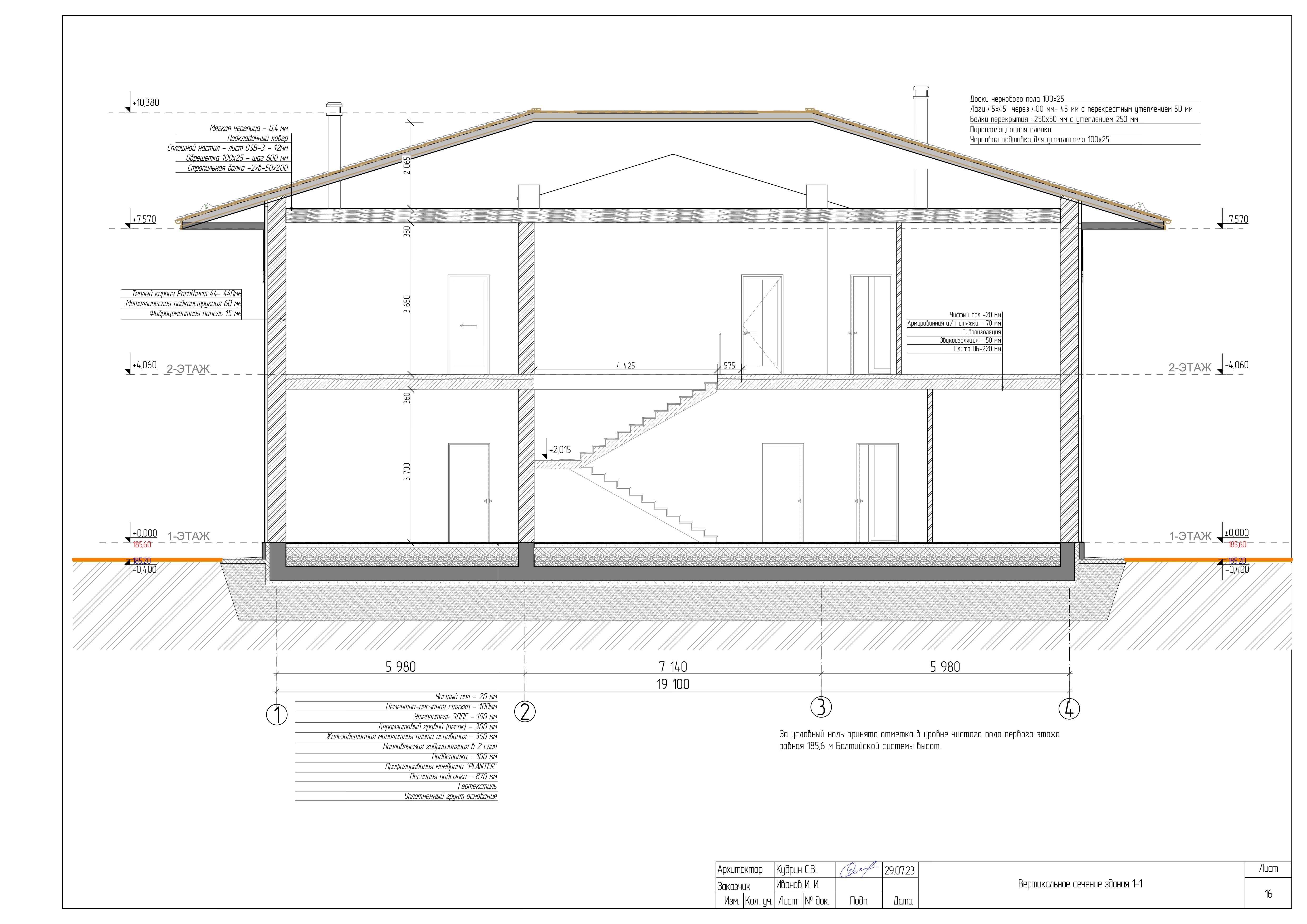 - Разрезы дома с высотными отметками
