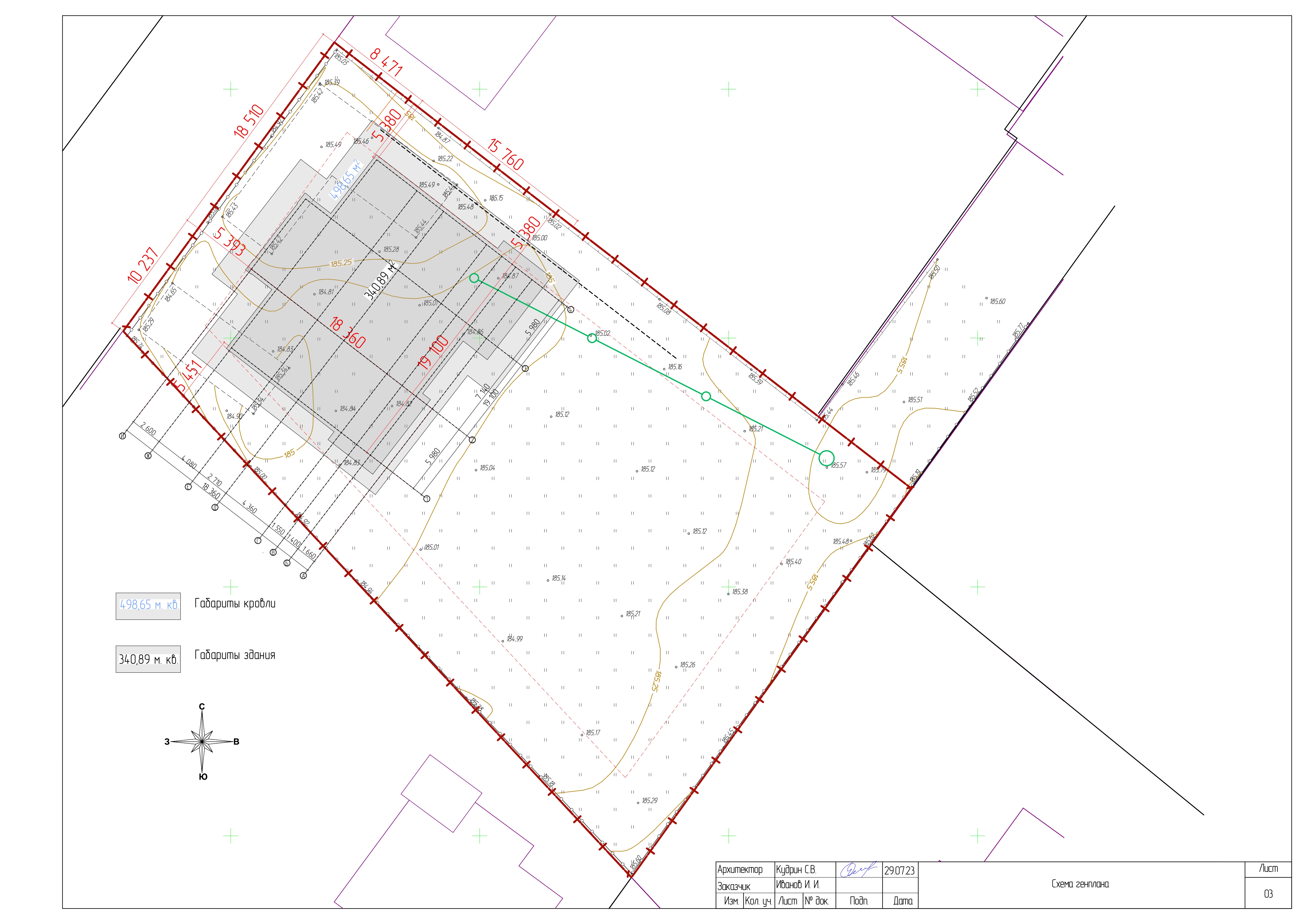 Разместим дом на участке, с учетом перепада высот рельефа, ориентации по сторонам света, градостроительных норм и правил землепользования. Выделим границы функциональных зон и малые архитектурные формы.